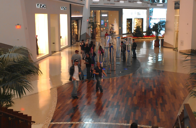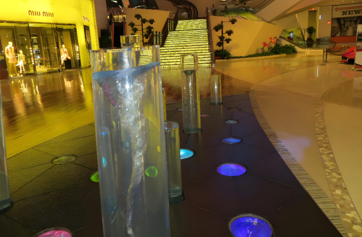 Envisioned and conceived by WET Design - Sun Valley, CA, a leading design firm that transforms natural elements into advanced kinetic art pieces, Show Motion Engineering, Inc. presents “Halo” by WET Design, the walk-through Water Art Installation that is part of Gallery Row for The Shops at Crystal at Aria Resort and Casino Mall. As a highlighted feature that’s connected to City Center’s separate and publicly accessible art exhibits, these twelve vacuum-sealed cylinders are elevated from the mall floor using installed