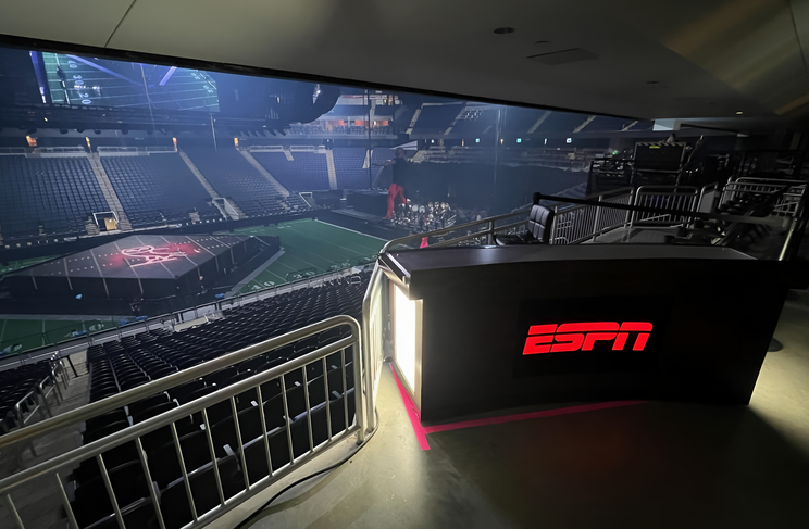 ESPN, this round-curved Commentator Desk features Scenic Wood covering, a clear Lexan Tabletop Piece, and a centered TV Screen with a perfectly matched curve to accompany the desk’s shape, highlighting the Prop’s desired aesthetic along with electronically integrated LED Light Paneling and Side-Piece Light Boxes.