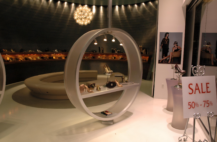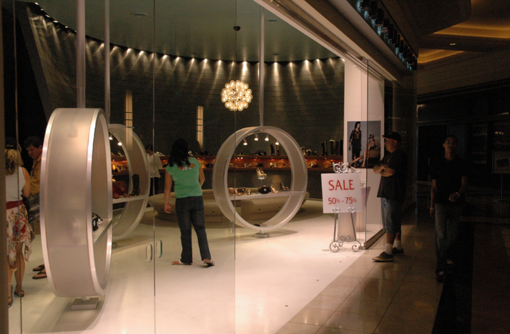 Custom-built for exhibiting designer shoes and purses, Show Motion Engineering, Inc. presents the design, engineering, and fabrication of the Pendulum Dial Display Stands for Giuseppe Zanotti. These ornately designed showcase structures are located at the Caesars Palace Forum Shops in Las Vegas and positioned in front of the Giuseppe Zanotti storefront for optimal allure. They are made entirely of wood, specially formed sheeted-metal cladding, and encased with opaque, clear acrylic.