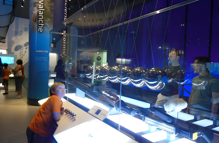 As a part of the Avalanche division of the Science Storms Exhibit at The Museum Of Science And Industry - Chicago, Illinois, Show Motion Engineering, Inc. presents the design, engineering, and fabrication of the large-scale interactive Newton’s Cradle Exhibit. Utilizing seven high-polished and custom-built stainless steel balls for the individual kinetic pendulums and suspended from a large metal structure with precision attachments, the museum guests are able to operate the machine-actuated Newton’s