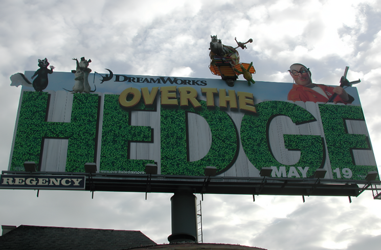 In preparation for the theatrical run of Over The Hedge in 2006, Show Motion Engineering, Inc. presents the custom Fiberglass sculptures, Metal Structures and Graphical Theming for the Over The Hedge Promotional Billboard - Hollywood, CA.; individual Character Sculpts were constructed and painted for R.J., Verne and Hammy, and were then mounted to a painted Fiberglass Clad with an internal Metal Structure that was then affixed to the top of the Sunset Blvd. and Holloway Dr. Billboard for a prime view.